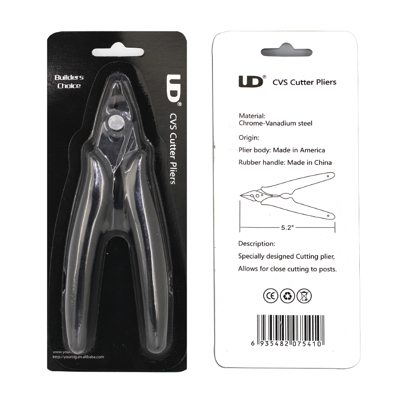 Build coils faster and easier with UD's cutter pliers. Made from lightweight and very durable chrome-vanadium steel, these pliers also feature a gripping area to support handling the base/deck of your rebuildable atomizer. Metallic part made in the USA, rubber handles in China.